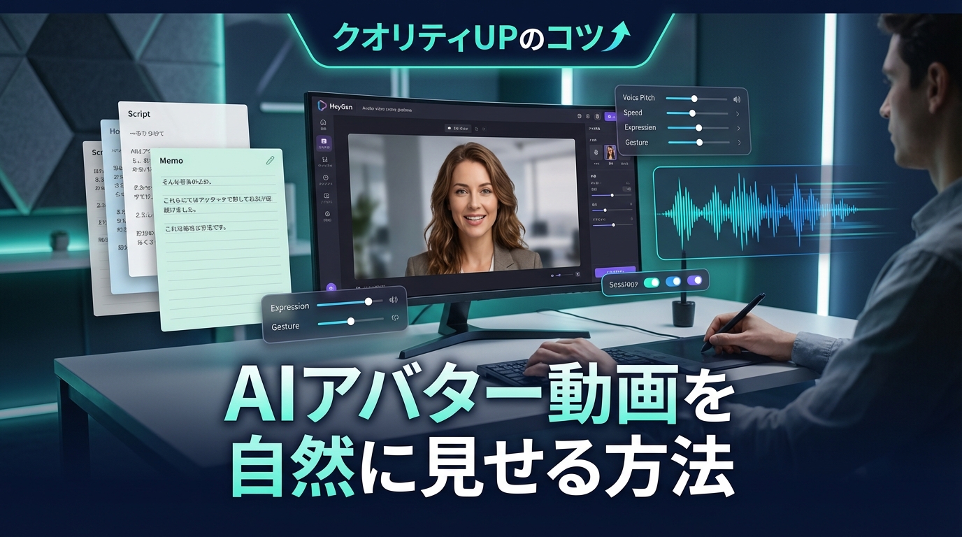 AIアバター動画の仕上がりは、ツールの性能だけでなくスクリプトの書き方・アバターの選び方・細かい設定の調整によって大きく変わります。同じHeyGenを使っていても、これらのポイントを押さえているかどうかで、完成度に明確な差が出ます。